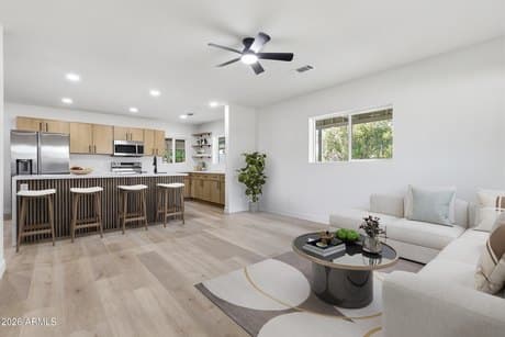Mid century character meets a comprehensive down to the studs renovation with plumbing and electrical updated throughout. This corner lot 2,080 sqft home with 4 beds and 3 baths offers open views of Camelback Mountain and bright, connected living spaces designed for gathering. The kitchen is anchored by a waterfall island and custom cabinetry, flowing easily into the main living area. Fully renovated bathrooms and a primary suite provide a calm retreat with a large walk in closet and a spa inspired bath. Roof and AC have been updated. The backyard features a grass lawn and paver patio, offering space to relax or entertain. Minutes to La Grande Orange Grocery & Pizzeria, Postino Arcadia, and The Henry, with redevelopment and new homes nearby supporting long term value.