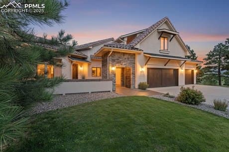 Spectacular Custom home w/ unobstructed views of Pikes Peak and Front Range. Rare location near Voyager & Interquest w/ a private country feel. Gorgeous curb appeal w/ stucco & stone, wood beams, iron gate, concrete tile roof, and front courtyard w/ fireplace. Open floor plan w/ soaring ceilings, oversized tile flooring, incredible mtn views, formal dining, sun room, loads of natural light, executive office w/ built ins, & gas fireplace. Gourmet kitchen features high level granite counters, solid alder cabinets w/ hardware, designer tile backsplash, Bosch appliances, built in butcher block cutting board, 2nd prep sink w/ disposal, trimmed out imperial range hood, & Viking gas range. Master suite features Karastan Luxury Kashmere nylon carpet with 1/2 inch 8-lb moisture barrier padding & mtn views. Attached 5 piece bath w/ hydromassage tub, spa walk in shower w/ rain head, tile flooring, separate sinks, and large walk in closet with his/her sides. Staircase w/ wrought iron spindles and custom trim work. Upper level boasts large open loft open to main level & an amazing bunk room w/ balcony. Every bedroom has an attached bathroom except for basement! Large walk out basement features wet bar, newer lvp flooring, & more mtn views! Backyard is perfect for entertaining w/ large multi-level stamped concrete patio, stone walls, iron railings, turf play set area, and loads of space. Kolbe windows and doors throughout. High end radiant heating system. Two Quiet Cool whole house fans for the house & one for the garage. Large main level laundry w/ 2nd hook up in basement. Large storage room! Oversized 3 car garage. MonierLife tile roof. Hunter Douglass window shades (some remote controlled). Newer well pump. Incredibly rare and valuable location. County land so no rules on short term renting for extra income! Pride of ownership doesn't begin to tell the story. Must see in person!