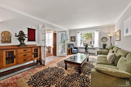 This rare convertible two-bedroom offers scale, light, and craftsmanship in one of the neighborhood's most sought-after cooperatives-an opportunity not to be missed. Welcome to Carlton House, a remarkable cooperative embracing late art deco and early mid-century modern styles, in the heart of the Jackson Heights Historic District. This elevated first-floor corner residence spans approximately 921 square feet and is bathed in southern, eastern, and western light, offering open views of the neighborhood's iconic English garden homes. The layout is exceptional-every inch of space is maximized with no wasted hallways or awkward corners. A dedicated dining area flows seamlessly into an oversized living room, while French doors lead to a versatile second room with recessed lighting -- perfect as an additional bedroom, home office, studio, library, or den. The windowed kitchen is a true centerpiece-renovated with sleek quartz countertops, abundant shaker cabinetry, and stainless-steel appliances. With its U-shape, generous counter space, and smart storage, it comfortably accommodates two home chefs at once, for easier family meals and entertaining. The bathroom is equally refined with marble-style tiles, a glass-enclosed tub, and modern fixtures. Extensive custom millwork elevates the home throughout: intricate 7-inch baseboards, skim-coated walls, coved ceilings, French doors with antique glass knobs, and restored radiator covers-all blending timeless craftsmanship with modern comfort. The king-sized primary bedroom is a serene retreat with multiple windows and a deep closet. In total, five large closets provide abundant storage rarely found in homes of this period. Carlton House residents enjoy premium amenities: a part-time doorman, fitness center, bike room, recently renovated laundry facilities, and an underground garage parking (with a short waitlist) -- a rare find in the neighborhood. A private landscaped sitting garden, a haven of peace, stretches the length of the building's backyard. Just outside, discover tree-lined blocks of historic architecture, Paseo and Travers Parks, the lively Sunday Greenmarket, and an array of acclaimed restaurants that define Jackson Heights living. Multiple subway lines, minutes away, allow for easy access to all of New York City.